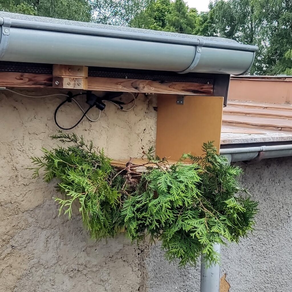 Po tom jejich hnízdění na sloupku zahradní terasy jsem se rozhodl, že se pokusím jim najít klidnější místo. Na zeď garáže jsem připevnil takovou trochu krytou plošinu, ale zatím se nezdá, že by je nějak zaujala. A to jsem jim to vyšperkoval větvemi z živého plotu. Dosud tam přistálo jen pár vrabců.