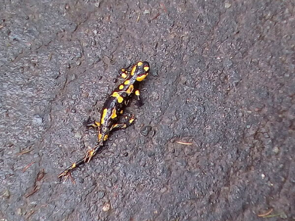 Drobně mží, ale šlape se dobře. Rovinka, slušná cesta, konzumuji proviant, abych odlehčil zádům (i když vlastně jen měním těžiště – zákon o zachování hmoty platí i na dálkových pochodech). Průběžně upíjím svůj energetický nápoj a začíná mi být veseleji. Šlapu celkem ostrým tempem a tak mě vcelku překvapilo, když se asi po 6 kilometrech za mnou objevil stále se zvětšující bílý bod. Po krátké době mne dostihuje a z bodu se vyklube dáma sportovního typu a neurčitého věku něco +/- 40. Abych nevypadal jako troska, srovnávám s ní krok. Není to jednoduché, po chvíli mi srdce tepe jako šílené. Snažím se nefunět a imitovat postaršího sportovce, ale začínám se dusit. Paní si všimla a trochu zvolňuje – konečně můžeme přerývaně komunikovat. Řeč plyne většinou o sportu, hlavně o kolech. Dáma stáčí řeč na manžela (nevím proč, nemám pocit, že by ze mne vyzařovala touha ji příležitostně znásilnit).